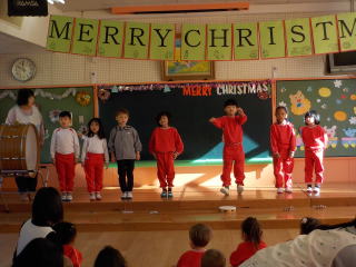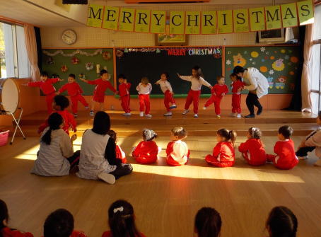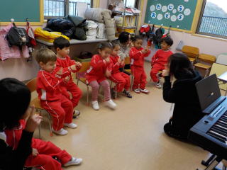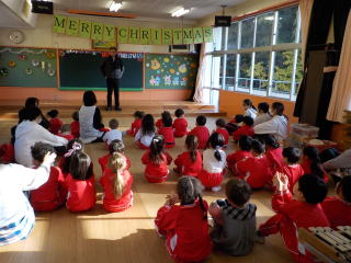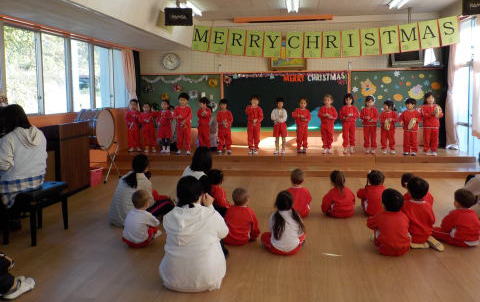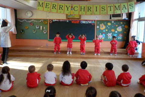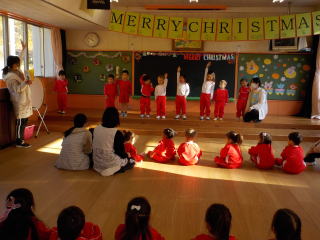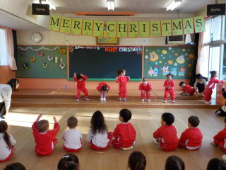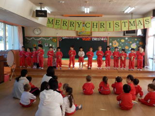 登園してきた子ども達は遊戯室に集まり、みんなでクリスマスやお正月の歌を歌いました。