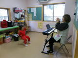 遊戯室に入って、楽器を手に取り、リズム打ちをしていました。