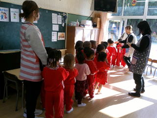 火事が起こったときにはどうしたらよいか話し合い、避難の練習をしました。