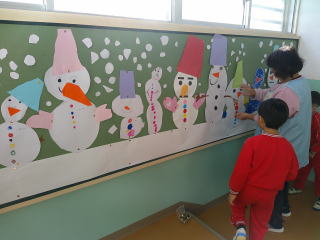 雪だるまの形を見に行き、部屋に戻って白い画用紙から雪だるまを作っていきました。