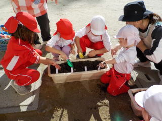 自分で選んだチューリップの球根をもらい、植え方を教えてもらいながらていねいに植えて、みんなで水やりをしました。