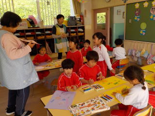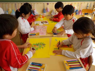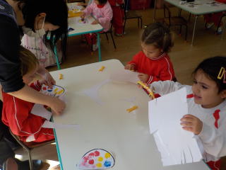 花組さんの年上の子ども達は、先日いも版で作ったキノコをハサミでていねいに切っていきました。