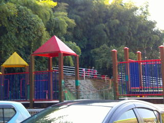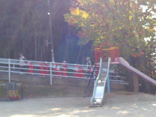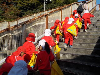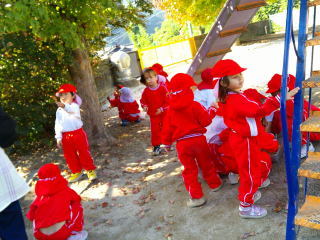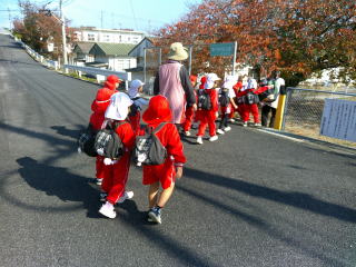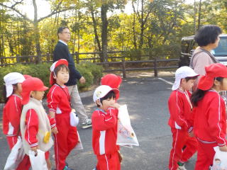 雪組さんは、カバンに水筒を入れて、幼稚園の坂を上り、上の公園まで落葉拾いに行きました。