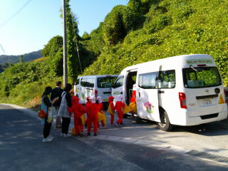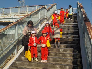 月組さんが幼稚園バスに乗って、通津駅から電車に乗って、幼稚園バスに乗って