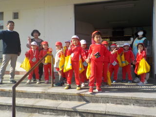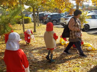 帰りは、幼稚園のバスで、子ども達が集めたどんぐりや落葉を黄色の袋にたくさん詰めて帰ってきました。
