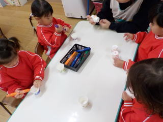 紙コップにマーカーで好きな絵を描いて、どんぐりを入れて後、セロテープでとめてもらいました。