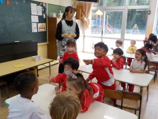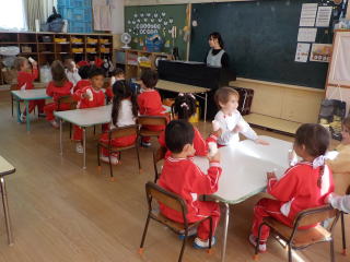 先生のピアノに合わせて、どんぐりマラカスを振って演奏を楽しみました。