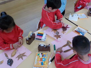 落葉を置いて組み合わせて周りにペンなどを使っていろいろなものを完成させました。
