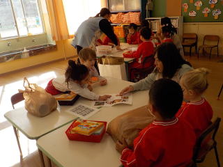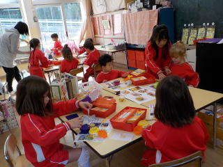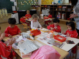 家から持ってきた廃材を持って、自分達で希望したお店屋さんのグループに集まりました。