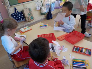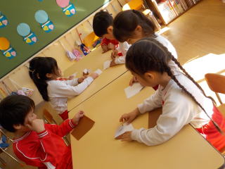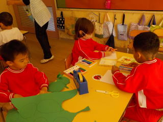 芋のはっぱを作ったり、自分が芋掘りをしているところ描いて、はさみで切ったりして作っていきました。