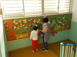 階段の壁面に、どんぐりをたくさん作って自分の好きなところに貼ってもらいました。