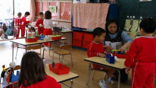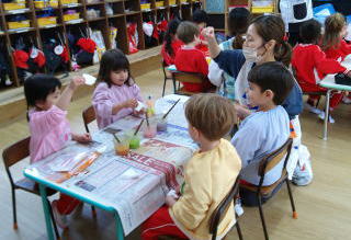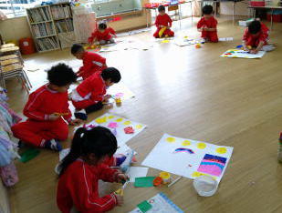 満3歳の子ども達は、金屏風に使う折紙を手でちぎって貼っていったり