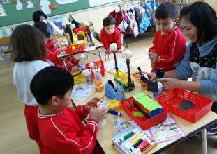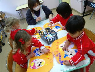 星組さんは、先週作ったひな人形のまわりにシールを貼って飾りつけました。