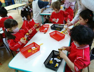3歳の子ども達は、折紙を折った線に合わせてハサミで切って糊付けをして作っていったりしました。