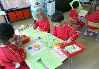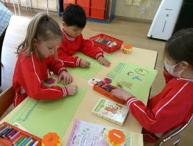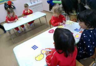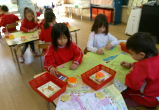 星組の子ども達は、おもいでの表紙に使うチューリップにシールを貼りました。